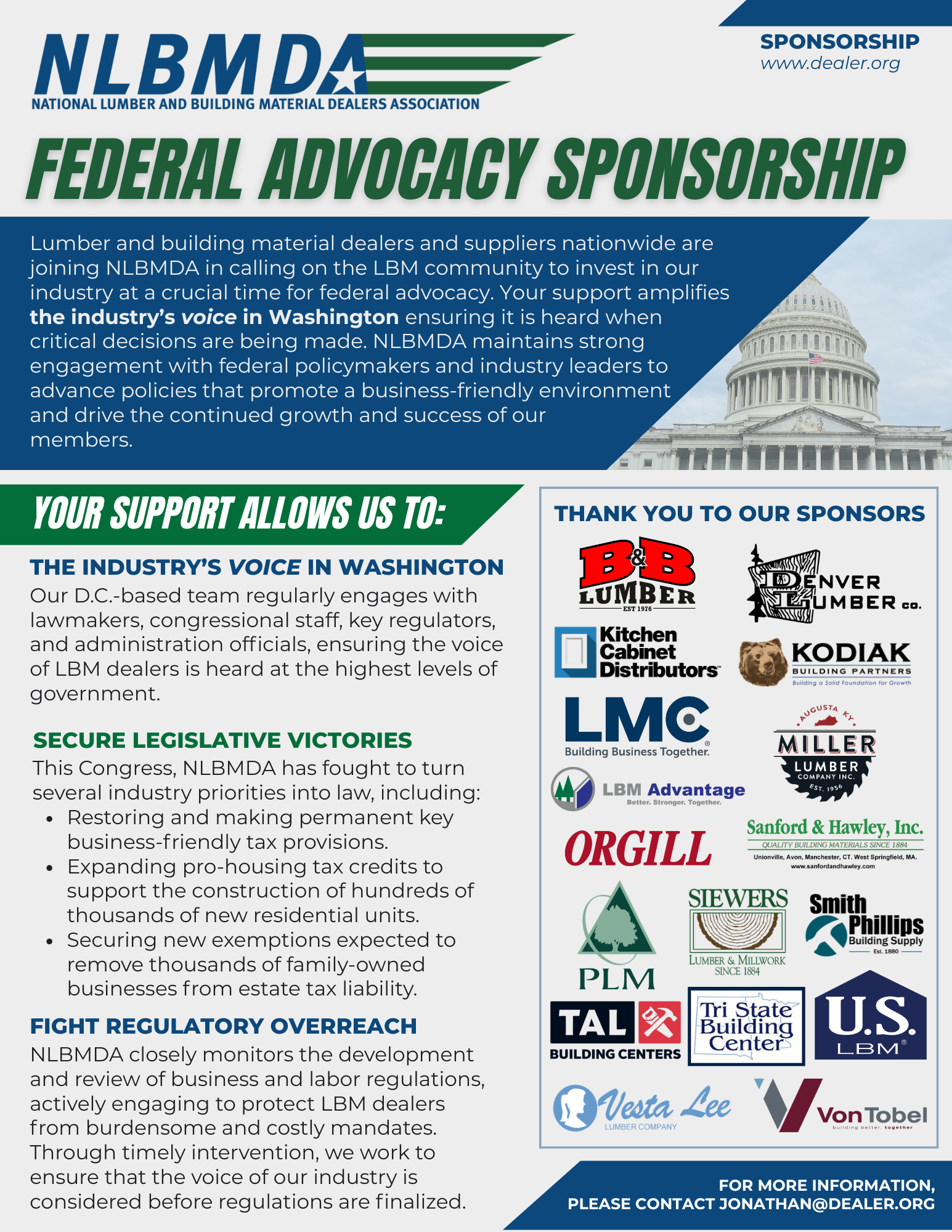 NLBMDA’s federal advocacy is your first line of defense against rising costs, unnecessary regulations, and threats to your bottom line. By becoming a Federal Advocacy Sponsor, you’re not just supporting policy work — you’re making a strategic investment in the future of the LBM industry. Our team is in Washington every day, working directly with lawmakers and regulators to ensure the LBM industry’s voice is heard. Recent wins include permanent small business tax relief, expanded estate tax exemptions, and the passage of some of the most pro-housing tax policies in over a decade — victories made possible by sponsors like you. As a Federal Advocacy Sponsor, you help shape the future of our industry. Your support strengthens our influence, raises our visibility, and secures the LBM industry's seat at the table when critical decisions are made. Join us in championing the priorities of LBM dealers nationwide — and ensure your interests are front and center in Washington’s most important policy discussions. For more information, please contact [email protected] READ MORELEARN MORE ABOUT OUR LEGISLATIVE PRIORITIES |